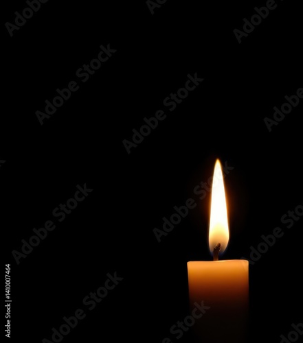 Single lit candle flame against pure black background, glow, object, spiritual