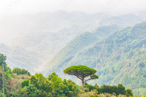 Single mediterranean pine tree growing on the top of the hill. Evergreen trees forests filling the gradient mountain range shrouded in fog. Misty nature in Italy.