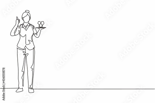 Single one line drawing of waitress stood up with thumbs-up gesture and brought a tray of drinking glasses to offer to restaurant guests. Modern continuous line draw design graphic vector illustration