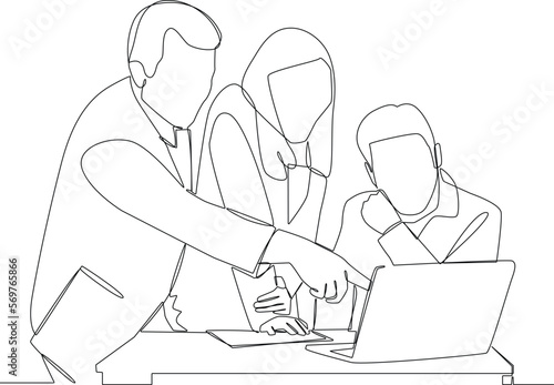Single one line drawing office workers discussing project or report in front of laptop at office. Brainstorming team. Business meeting concept. Continuous line draw design graphic vector illustration