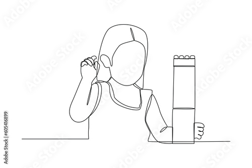Single one-line drawing girls playing building block with toys. Children playing with toys concept. Continuous line drawing illustration