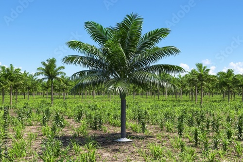 palm tree, tropical, plantation, green, sunny, sky, landscape, vegetation, nature, tree, foliage, bright, daytime, summer, environment, growth, flora, botanical, scenic, view, background, palm tree, lush, verdant, sunlight, clear sky, flora, natural, scene, photo, image, picture, photo, graphic, rendering, digital artwork, illustration, tropical paradise, exotic, palm grove, coconut palm, palm leaf, canopy, underbrush