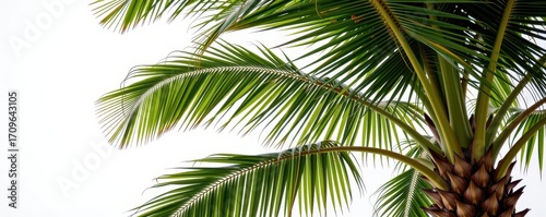 Single palm tree isolated on bright white background, lush green foliage, tropical vibes, summer aesthetic, bright, design element, flora