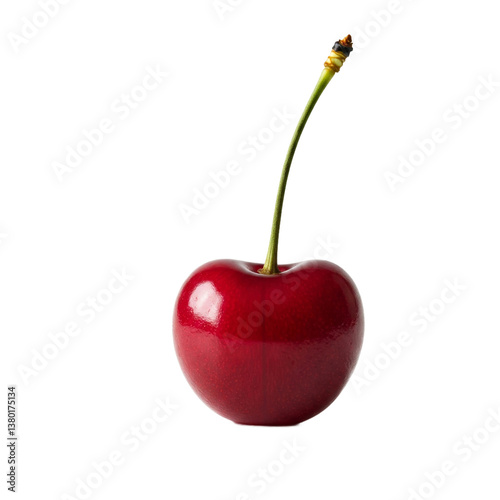 Single red cherry, glossy skin, green stem, isolated on a transparent background, png image, showcasing freshness and summer fruit