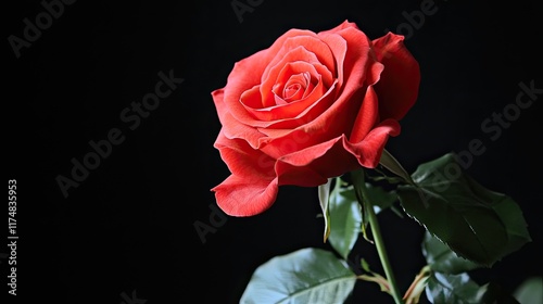 rose, red, flower, bloom, flower petals, blossom, stem, leaf, green, dark, background, black, beauty, nature, romantic, love, elegance, passion, delicate, vibrant, colours, texture, photo, macro, closeup, detail, single, isolated, plant, botanical, floral, gorgeous, stunning, exquisite, honed, shape, form, light, shadow, contrast, art, image