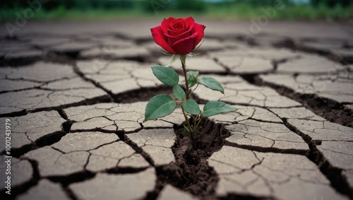 red, rose, cracked, earth, dry, bloom, green, resilience, drought, dirtied, barren, desert, survival, nature, life, vibrant, flower, contrast, harsh, terrain, parched, adversity, texture, still, environment, growing, desertification, germinating, symbolic, flower petals, beauty, struggle, desolate, floral, wilderness, growth, flourish, scarcity