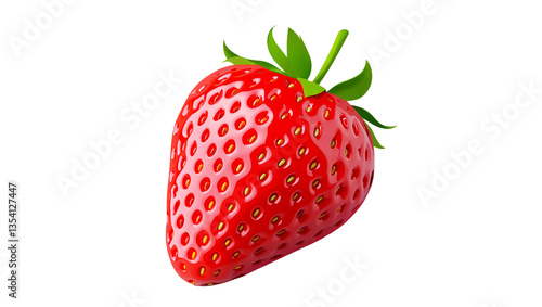single red strawberry with tiny seeds and a vibrant green calyx, rendered in realistic high-resolution style with vivid colors, isolated on a transparent PNG background. Perfect for food branding, pac