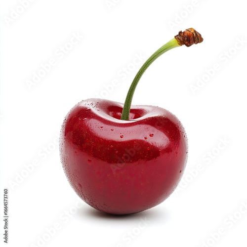 Single, ripe cherry, glossy red, wet, stem, isolated on white