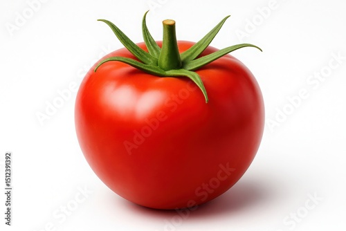 Single Ripe Red Tomato with Green Stem on White Background for Fresh Produce