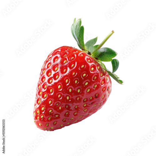 Single, ripe strawberry, vibrant red, speckled with tiny seeds, green leaves attached to stem