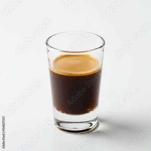 Single shot of dark espresso with golden crema served in a transparent glass cup, isolated on a white background.
