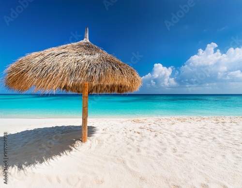 single thatched beach umbrella on white sand with turquoise sea horizon caribbean tropical vacation banner or header wallpaper