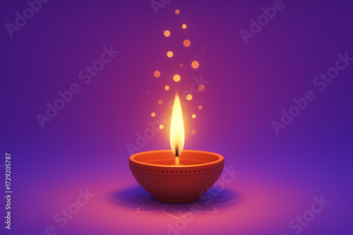 Single traditional earthen lamp diya casting a warm orange light on a rich purple background with rising ethereal bokeh light elements symbolizing hope and joy happy diwali and happy dipaboli