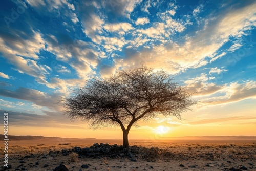 single tree, beautiful blue sky at desert with cloudy shapes, moor and rocks at sunset , ai