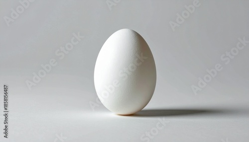 “Single white egg standing upright on smooth light surface with neutral gray background minimalist photography”