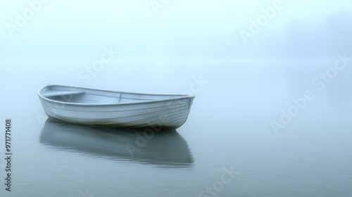 Single white rowboat on calm lake with fog in the background. Serenity, peace and contemplation concept