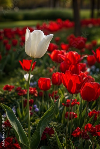 flower, tulip, garden, red, white, single, flower, lush, spring, nature, bloom, beauty, plant, flora, summer, colours, season, day, park, pink, purple, floral, beautiful, contrast, striking, vibrant, field, blossom, botany, growing, growth, outdoors, greenery, vibrant color, detail, closeup