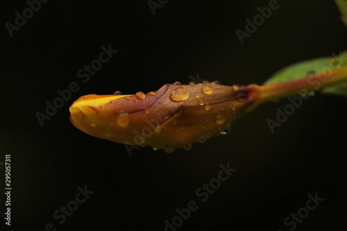 single yellow lily bud in the rainy day with some rain drops on the bud