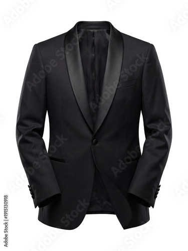 Single-breasted black tuxedo jacket with satin shawl lapel