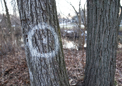 tree, trunk, marked, cutting, harvesting, scar, painted, old, broken, wood, wood, park, cleaning, winter, bare, no people, loneliness, solitude, resource, deforestation, recycling, timbering