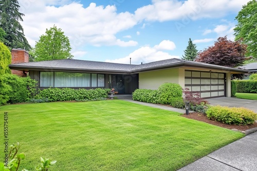 Single-story suburban house with manicured front lawn, modern garage door, and lush landscaping under a blue sky