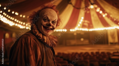 Sinister Clown with Creepy Grin in Vintage Circus Tent with Dramatic Lighting