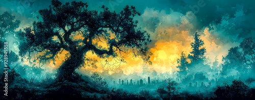 Sinister landscape with a spooky tree and a cemetery shrouded in fog.