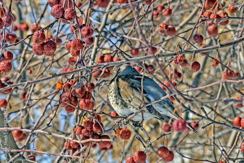 Siskin sits on a branch of a wild apple tree on a sunny spring day