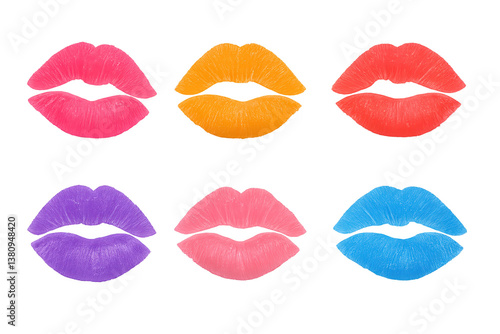Six brightly colored lipstick kiss prints in shades of pink, orange, red, purple, peach, and blue are arranged in two rows and isolated on a transparent background, symbolizing Kissing Day