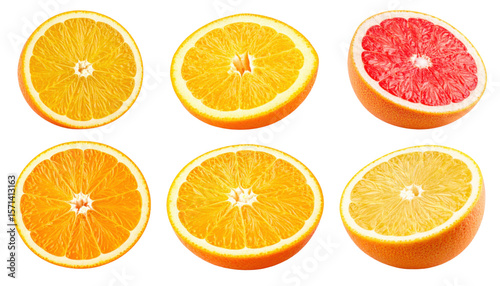Six halved citrus fruits showcasing varying colors and textures of orange, lemon, and grapefruit slices.