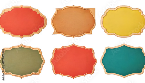 Six ornate blank labels in assorted colors isolated on clear png background