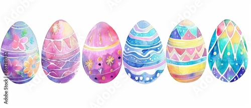 Six pastel Easter eggs with colorful designs.