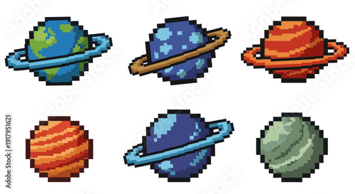 Six pixel art planets displayed in two rows, showcasing different colors and ring styles