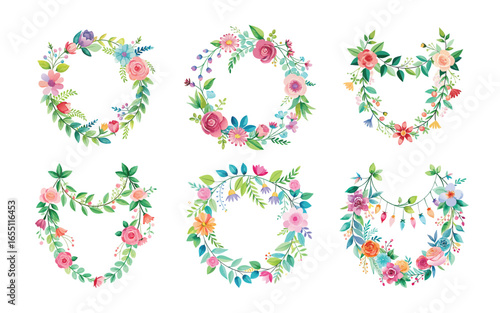 Six Watercolor Floral Wreaths Colorful Flower Arrangements Botanical Designs