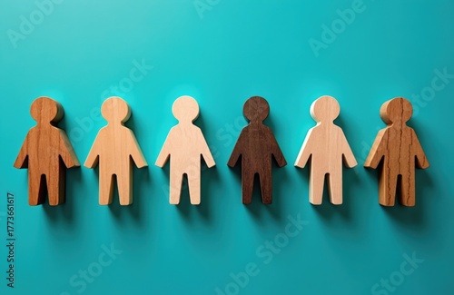 wooden, figure, human, diversity, inclusion, people, block, shape, line, arrangement, horizontal, background, blue, turquoise, cyan, colours, standing, uniform, identical, similar, different, unique, contrast, highlight, variation, differentiation, distinction, group, team, collaboration, equality, equity, oneness, solidarity, abstract, symbol, representation, concept, social, issue, discrimination, racism, acceptance, tolerance, understanding, community