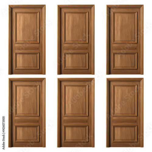 Six Wooden Interior Doors with Classic Design and Texture, isolated on transparent background.
