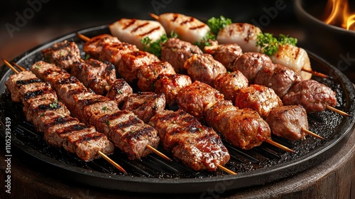 Sizzling barbecue feast grilled skewers and meats outdoor setting food photography culinary art