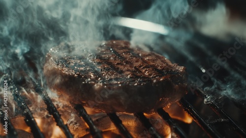 Sizzling Beef Burger on a Hot Grill with Rising Smoke in Darkness