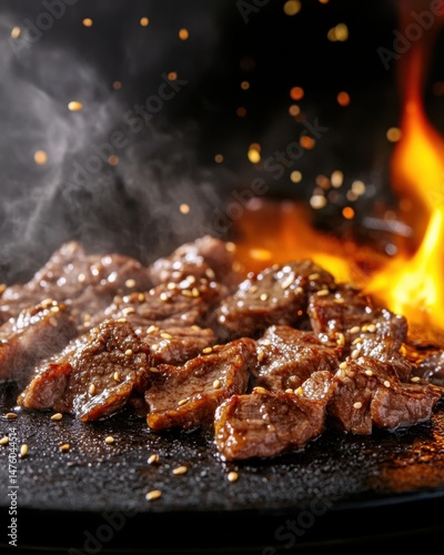 Sizzling beef cubes with sesame seeds cooking on a hot plate with flames and smoke close up food photography