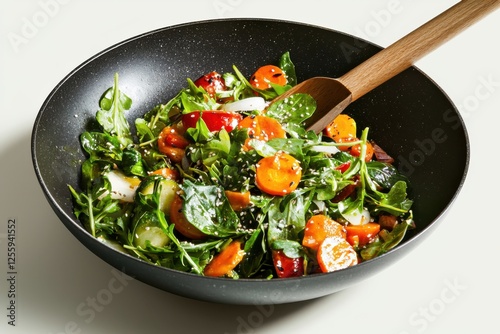 Sizzling colorful vegetable stirfry in skillet bright indoor kitchen culinary photography vibrant composition side angle view