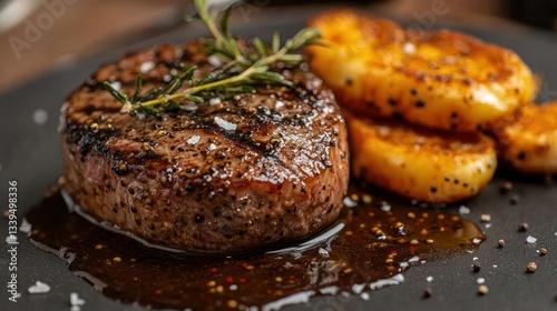 steak, beef, filet, mignon, grilled, roasted, potato, herb, rosemary, pepper, salt, delicious, food, cookery, dinner, epicure, appetising, flavorful, juicy, tender, meat, protein, culinary, gastronomy, savoury, plate, meal, tasty, deliciously, dark, brown, seared, eatery, eating, photo