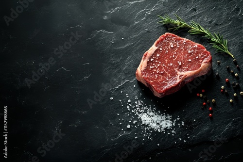 Sizzling raw steak preparation gourmet kitchen food photography dark stone background close-up view culinary artistry