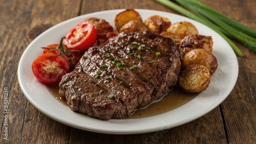Sizzling steak served with roasted potatoes and cherry tomatoes on a white plate, garnished with chopped herbs.