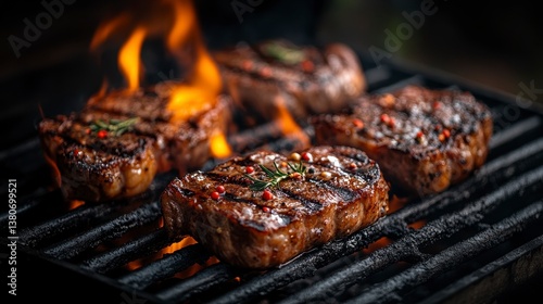 Sizzling steaks on a grill with flames. Close-up view of grilled meat with seasoning