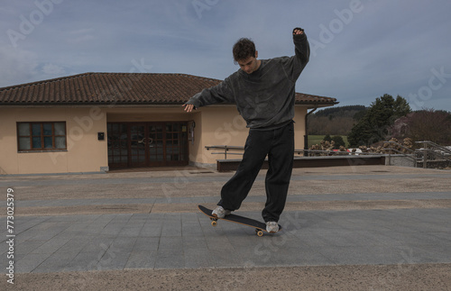 Skateboarder mastering balance in urban plaza, copy space.