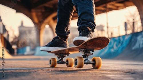 Skateboarder Poised on Board in Urban Skatepark at Golden Hour