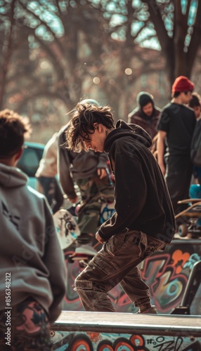 skateboarding, diverse, group, urban, skatepark, tip, trick, graffiti, camaraderie, skill, exchange, vibrant, lively, scene, atmosphere, youth, hobby, sport, culture, community, urban art, park, recreation, learning, guidance, active, lifestyle, social, interaction, gathering, exercise, fun, creativity, subculture, energy