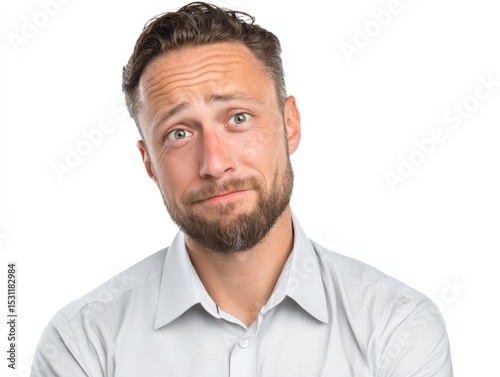 man, portrait, face, expression, sceptical, doubtful, hesitant, uncertain, pensive, thoughtful, confused, questioning, perplexed, suspicious, concerned, worried, serious, head shot, closeup, white, background, studio, light, casual attire, shirt, person, model, adult, male, beard, hair, eye, emotion, feeling, mood, thought, human, body, attractive, stylish, clean, professional, corporate