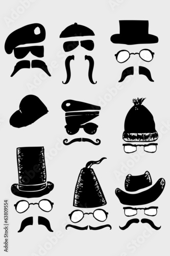 hand, draw, vignetting, doodle, hand-drawn, hat, black, moustache, eyeglass, asian, cowboy, military, army, wool, triangle, sunglasses, background, vector, mask, isolated, moustache, funky, fashion, illustration, design, group, set, vintage, style, accessory
