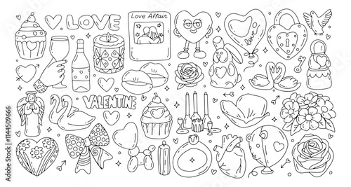 Sketchy thin lined hand drawn doodles cartoon big set of Love and Valentine s Day objects and symbols Vector romantic illustration